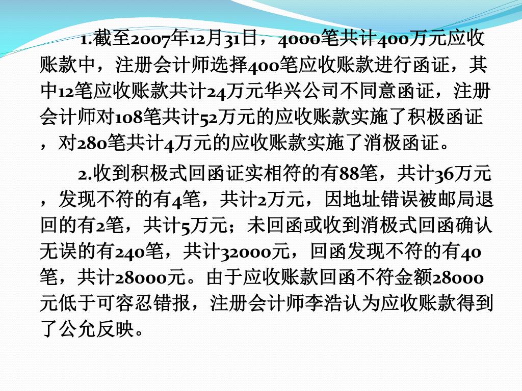 1.截至2007年12月31日,4000笔共计400万元应收账款中,注册会计师选择400笔应收账款进行函证,其中12笔应收账款共计24万元华兴公司不同意函证,注册会计师对108笔共计52万元的应收账款实施了积极函证,对280笔共计4万元的应收账款实施了消极函证。1.截至2007年12月31日,4000笔共计400万元应收账款中,注册会计师选择400笔应收账款进行函证,其中12笔应收账款共计24万元华兴公司不同意函证,注册会计师对108笔共计52万元的应收账款实施了积极函证,对280笔共计4万元的应收账款实施了消极函证。 2.收到积极式回函证实相符的有88笔,共计36万元,发现不符的有4笔,共计2万元,因地址错误被邮局退回的有2笔,共计5万元;未回函或收到消极式回函确认无误的有240笔,共计32000元,回函发现不符的有40笔,共计28000元。由于应收账款回函不符金额28000元低于可容忍错报,注册会计师李浩认为应收账款得到了公允反映。