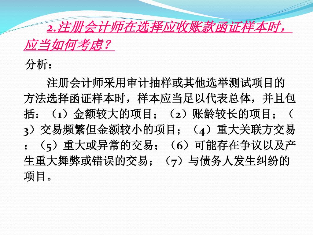 2.注册会计师在选择应收账款函证样本时,应当如何考虑?2.注册会计师在选择应收账款函证样本时,应当如何考虑? 分析: 注册会计师采用审计抽样或其他选举测试项目的方法选择函证样本时,样本应当足以代表总体,并且包括:(1)金额较大的项目;(2)账龄较长的项目;(3)交易频繁但金额较小的项目;(4)重大关联方交易;(5)重大或异常的交易;(6)可能存在争议以及产生重大舞弊或错误的交易;(7)与债务人发生纠纷的项目。