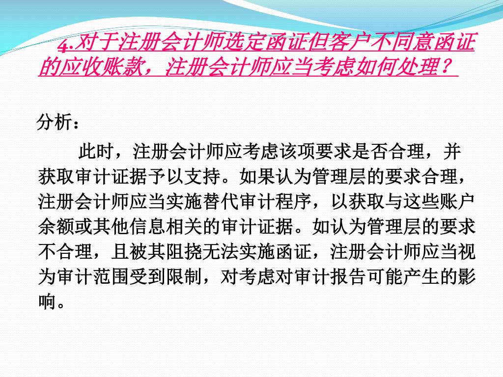 4.对于注册会计师选定函证但客户不同意函证的应收账款,注册会计师应当考虑如何处理?4.对于注册会计师选定函证但客户不同意函证的应收账款,注册会计师应当考虑如何处理? 分析: 此时,注册会计师应考虑该项要求是否合理,并获取审计证据予以支持。如果认为管理层的要求合理,注册会计师应当实施替代审计程序,以获取与这些账户余额或其他信息相关的审计证据。如认为管理层的要求不合理,且被其阻挠无法实施函证,注册会计师应当视为审计范围受到限制,对考虑对审计报告可能产生的影响。
