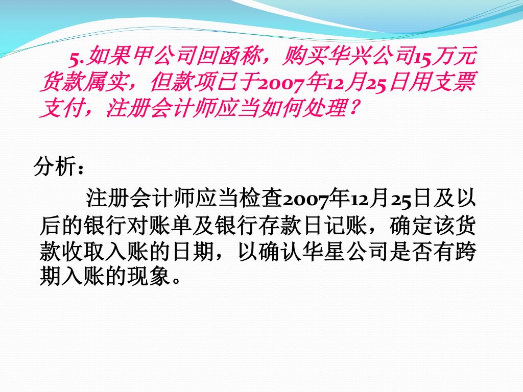 5.如果甲公司回函称,购买华兴公司15万元货款属实,但款项已于2007年12月25日用支票支付,注册会计师应当如何处理?5.如果甲公司回函称,购买华兴公司15万元货款属实,但款项已于2007年12月25日用支票支付,注册会计师应当如何处理? 分析: 注册会计师应当检查2007年12月25日及以后的银行对账单及银行存款日记账,确定该货款收取入账的日期,以确认华星公司是否有跨期入账的现象。