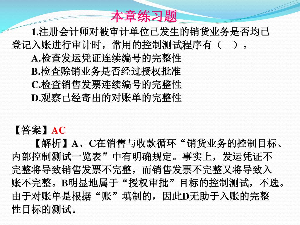 本章练习题1.注册会计师对被审计单位已发生的销货业务是否均已登记入账进行审计时,常用的控制测试程序有( )。A.检查发运凭证连续编号的完整性B.检查赊销业务是否经过授权批准C.检查销售发票连续编号的完整性D.观察已经寄出的对账单的完整性 本章练习题1.注册会计师对被审计单位已发生的销货业务是否均已登记入账进行审计时,常用的控制测试程序有( )。A.检查发运凭证连续编号的完整性B.检查赊销业务是否经过授权批准C.检查销售发票连续编号的完整性D.观察已经寄出的对账单的完整性 【答案】AC【解析】A、C在销售与收款循环“销货业务的控制目标、内部控制测试一览表”中有明确规定。事实上,发运凭证不完整将导致销售发票不完整,而销售发票不完整又将导致入账不完整。B明显地属于“授权审批”目标的控制测试,不选。由于对账单是根据“账”填制的,因此D无助于入账的完整性目标的测试。