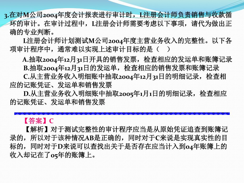 3.在对M公司2004年度会计报表进行审计时,L注册会计师负责销售与收款循环的审计。在审计过程中,L注册会计师需要考虑以下事项,请代为做出正确的专业判断。L注册会计师计划测试M公司2004年度主营业务收入的完整性。以下各项审计程序中,通常难以实现上述审计目标的是( ) A.抽取2004年12月31日开具的销售发票,检查相应的发运单和账簿记录B.抽取2004年12月31日的发运单,检查相应的销售发票和账簿记录C.从主营业务收入明细账中抽取2004年12月31日的明细记录,检查相应的记账凭证、发运单和销售发票D.从主营业务收入明细账中抽取2005年1月1日的明细记录,检查相应的记账凭证、发运单和销售发票 【答案】C【解析】对于测试完整性的审计程序应当是从原始凭证追查到账簿记录的,所以对于该种情况AB是正确的,同时对于C来说是实现真实性的目标的,同时对于D来说可以查找出关于是否存在应当计入到04年账簿上的收入却记在了05年的账簿上。