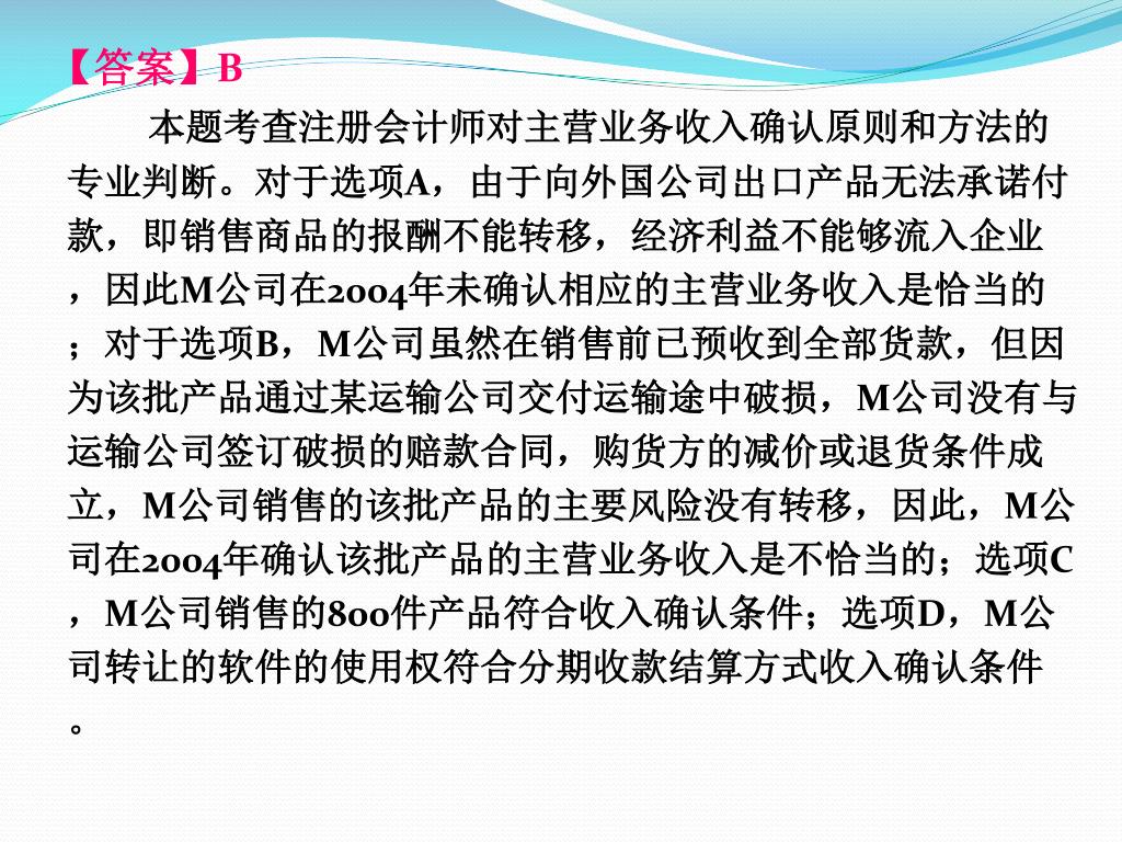 4. M公司存在以下与收入确认相关的交易处理情况,其中,不正确的是( )。A.M公司拟以在2004年12月按合同约定以离岸价向某外国公司出口产品时,对方告知由于其所在国开始实施外汇管制,无法承诺付款。为了开拓市场,M公司仍于2004年末交付产品,但在2004年未确认相应的主营业务收入B.M公司于2004年末委托某运输公司向某企业交付一批产品。由于验收时发现部分产品有破损,该企业按照合同约定要求M公司采取减价等补偿措施或者全部予以退货,M公司以产品破损是运输公司责任为由而拒绝对方要求。由于发货前已收到该企业预付的全部货款,M公司于2004年确认了相应主营业务收入C.M公司于2004年12月初以每件500元(不含增值税)的价格向某公司交付了1000件产品。双方约定,在该公司付清货款前,尽管M公司不再对所交付的产品实施继续管理和控制,但仍对尚未收款的该部分产品保留法定所有权。截止2004年末,M公司收取了该公司支付的其中800件产品的货款,确认了主营业务收入400000元D.M公司于2004年向某公司转让了一项软件的使用权,使用费为500000元,M公司不提供后期服务。合同约定,该公司在2004年和2005年各支付250000元。M公司于2004年实际收到200000元,但仍在当年确认了250000元收入