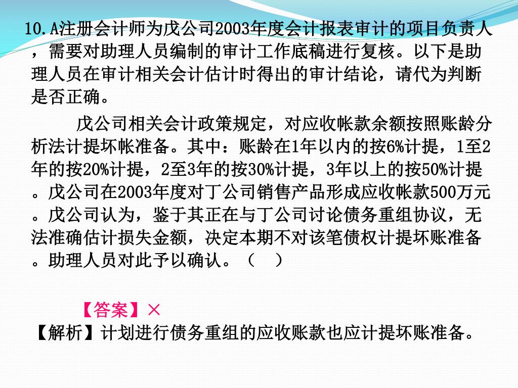 10.A注册会计师为戊公司2003年度会计报表审计的项目负责人,需要对助理人员编制的审计工作底稿进行复核。以下是助理人员在审计相关会计估计时得出的审计结论,请代为判断是否正确。 戊公司相关会计政策规定,对应收帐款余额按照账龄分析法计提坏帐准备。其中:账龄在1年以内的按6%计提,1至2年的按20%计提,2至3年的按30%计提,3年以上的按50%计提。戊公司在2003年度对丁公司销售产品形成应收帐款500万元。戊公司认为,鉴于其正在与丁公司讨论债务重组协议,无法准确估计损失金额,决定本期不对该笔债权计提坏账准备。助理人员对此予以确认。( ) 【答案】×【解析】计划进行债务重组的应收账款也应计提坏账准备。