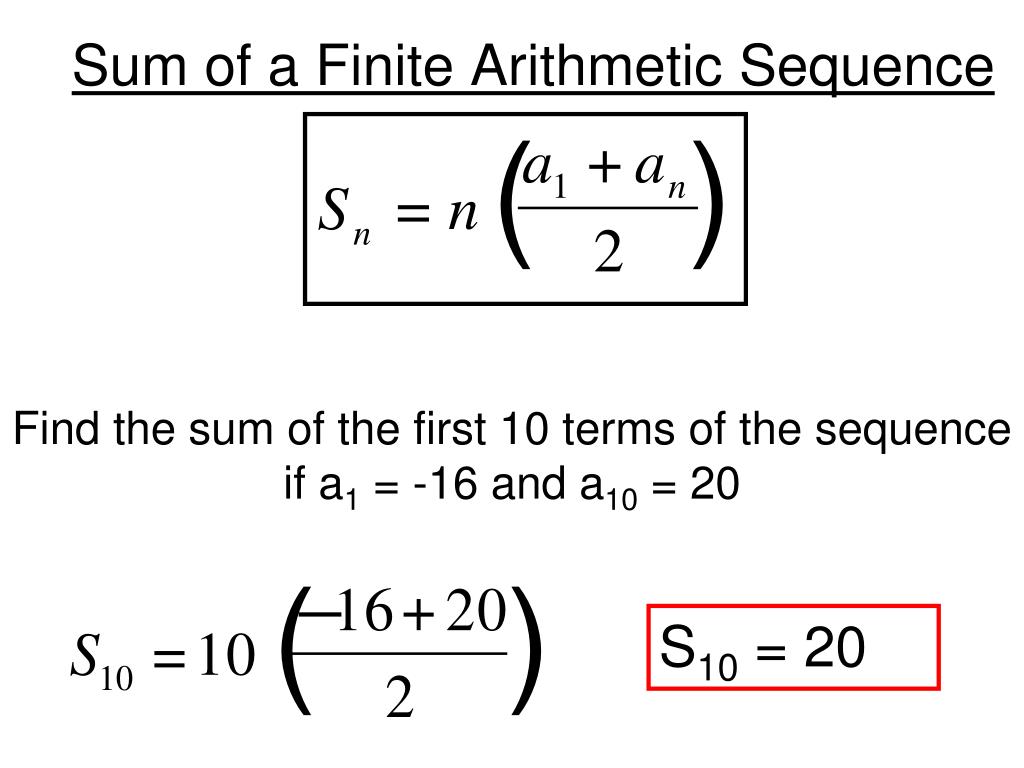 ( ) ( ) Sum of a Finite Arithmetic Sequence Find the sum of the first 10 terms of the sequence if a1 = -16 and a10 = 20 S10 = 20