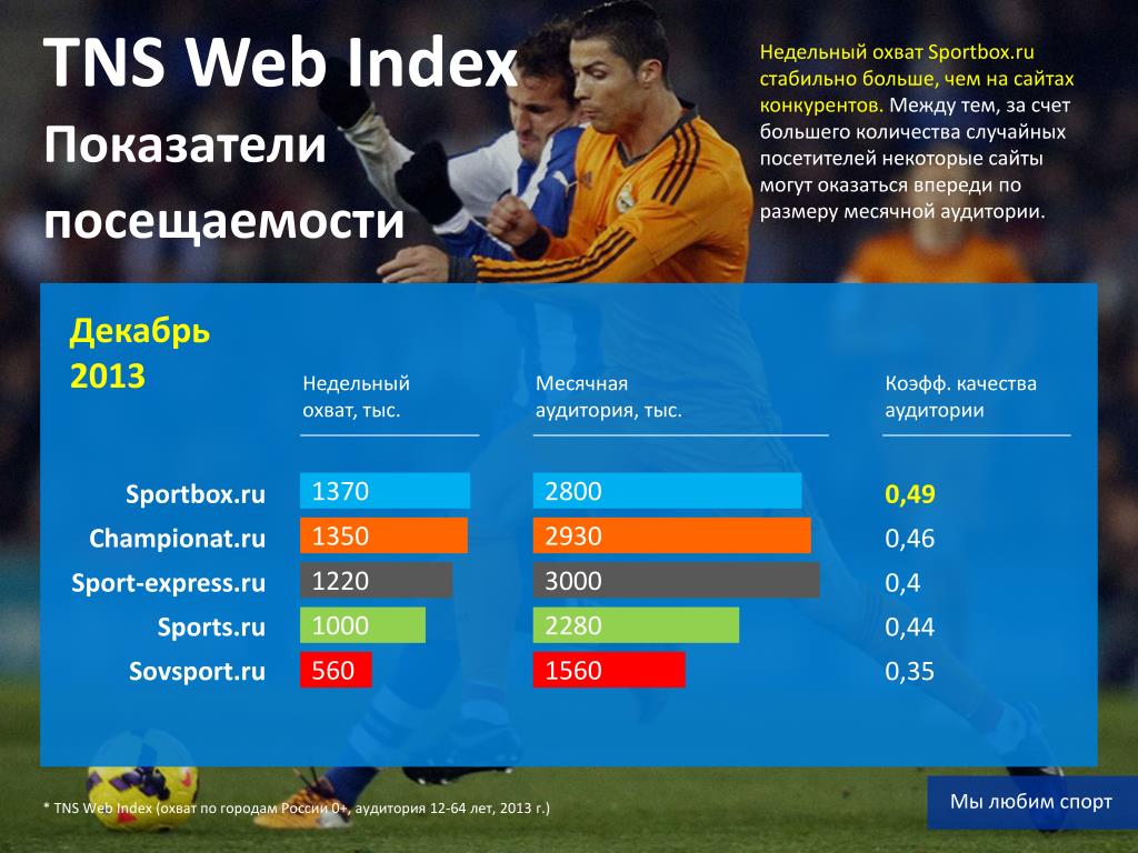 TNSWeb Index Показатели посещаемости Ноябрь 2013 Недельный охват, тыс. Месячная аудитория, тыс. Коэфф. постоянства аудитории Sportbox.ru Championat.ru Sport-express.ru Sports.ru Sovsport.ru 0,46 0,48 0,36 0,42 0,33 1870 4070 1840 3830 1650 4300 1220 2867 730 2200 Мы любим спорт * TNS Web Index (охват по городам России 0+, аудитория 12-64 лет, 2013 г.)
