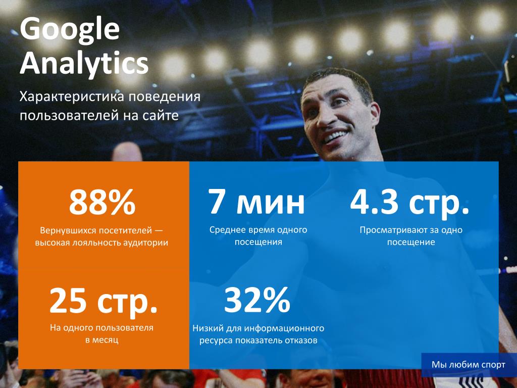 Google Analytics Характеристика поведения пользователей на сайте 7 мин 4.3 стр. 88% Среднее время одного посещения Просматривают за одно посещение Вернувшихся посетителей — высокая лояльность аудитории 32% 25 стр. На одного пользователя в месяц Низкий для информационного ресурса показатель отказов Мы любим спорт