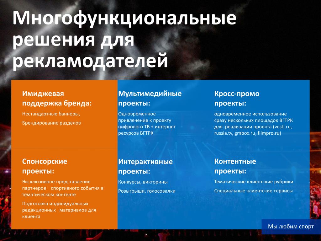 Многофункциональные решения для рекламодателей Имиджевая поддержка бренда: Нестандартные баннеры, Брендирование разделов Мультимедийные проекты: Одновременное привлечение к проекту цифрового ТВ + интернет ресурсов ВГТРК Кросс-промопроекты: одновременное использование сразу нескольких площадок ВГТРК для реализации проекта (vesti.ru, russia.tv, gmbox.ru, filmpro.ru) Спонсорскиепроекты: Эксклюзивное представление партнеров спортивного события в тематическом контенте Подготовка индивидуальных редакционных материалов для клиента Контентныепроекты: Тематические клиентские рубрики Специальные клиентские сервисы Интерактивныепроекты: Конкурсы, викторины Розыгрыши, голосовалки Мы любим спорт