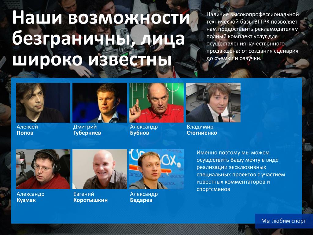 Наши возможности безграничны, лица широко известны Наличие высокопрофессиональной технической базы ВГТРК позволяет нам предоставить рекламодателям полный комплект услуг для осуществления качественного продакшена: от создания сценария до съемки и озвучки. Алексей Попов Дмитрий Губерниев Александр Бубнов Владимир Стогниенко Именно поэтому мы можем осуществить Вашу мечту в виде реализации эксклюзивных специальных проектов с участием известных комментаторов и спортсменов Александр Кузмак Евгений Коротышкин Александр Бедарев Мы любим спорт