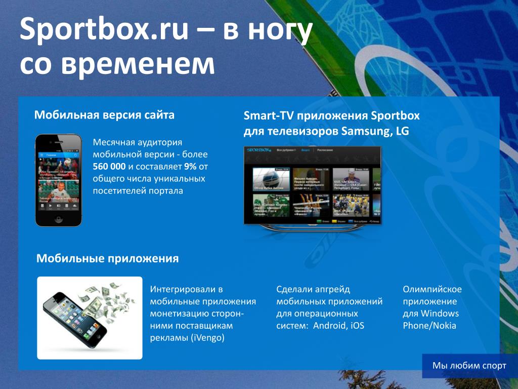 Sportbox.ru – в ногу со временем Мобильная версия сайта Smart-TV приложения Sportbox для телевизоров Samsung, LG Месячная аудитория мобильной версии -более 560 000 и составляет 9% от общего числа уникальных посетителей портала Мобильные приложения Интегрировали в мобильные приложения монетизацию сторон-ними поставщикам рекламы (iVengo) Сделали апгрейд мобильных приложений для операционных систем: Android, iOS Олимпийское приложение для WindowsPhone/Nokia Мы любим спорт