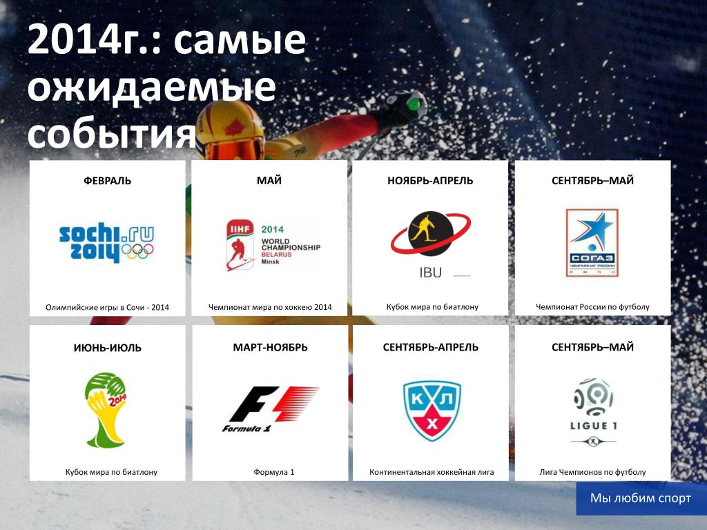 2014г.: самые ожидаемые события Олимпийские игры в Сочи - 2014 ФЕВРАЛЬ МАЙ НОЯБРЬ-АПРЕЛЬ СЕНТЯБРЬ–МАЙ Кубок мира по биатлону Чемпионат России по футболу Чемпионат мира по хоккею 2014 СЕНТЯБРЬ-АПРЕЛЬ СЕНТЯБРЬ–МАЙ МАРТ-НОЯБРЬ ИЮНЬ-ИЮЛЬ Кубок мира по биатлону Формула 1 Континентальная хоккейная лига Лига Чемпионов по футболу Мы любим спорт