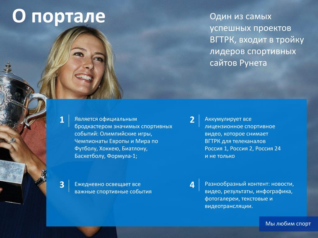 О портале Один из самых успешных проектов ВГТРК, входит в тройку лидеров спортивных сайтов Рунета 1 2 Является официальным бродкастером значимых спортивных событий: Олимпийские игры, Чемпионаты Европы и Мира по Футболу, Хоккею, Биатлону, Баскетболу, Формула-1; Аккумулирует все лицензионное спортивное видео, которое снимает ВГТРК для телеканалов Россия 1, Россия 2, Россия 24 и не только 3 4 Разнообразный контент: новости, видео, результаты, инфографика, фотогалереи, текстовые и видеотрансляции. Ежедневно освещает все важные спортивные события Мы любим спорт