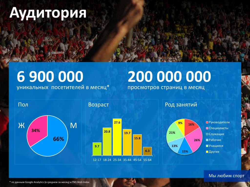 Аудитория 6 900 000 200 000 000 уникальных посетителей в месяц* просмотров страниц в месяц Пол Род занятий Возраст Ж М Мы любим спорт * по данным Google Analytics (в среднем за месяц) и TNS Web Index