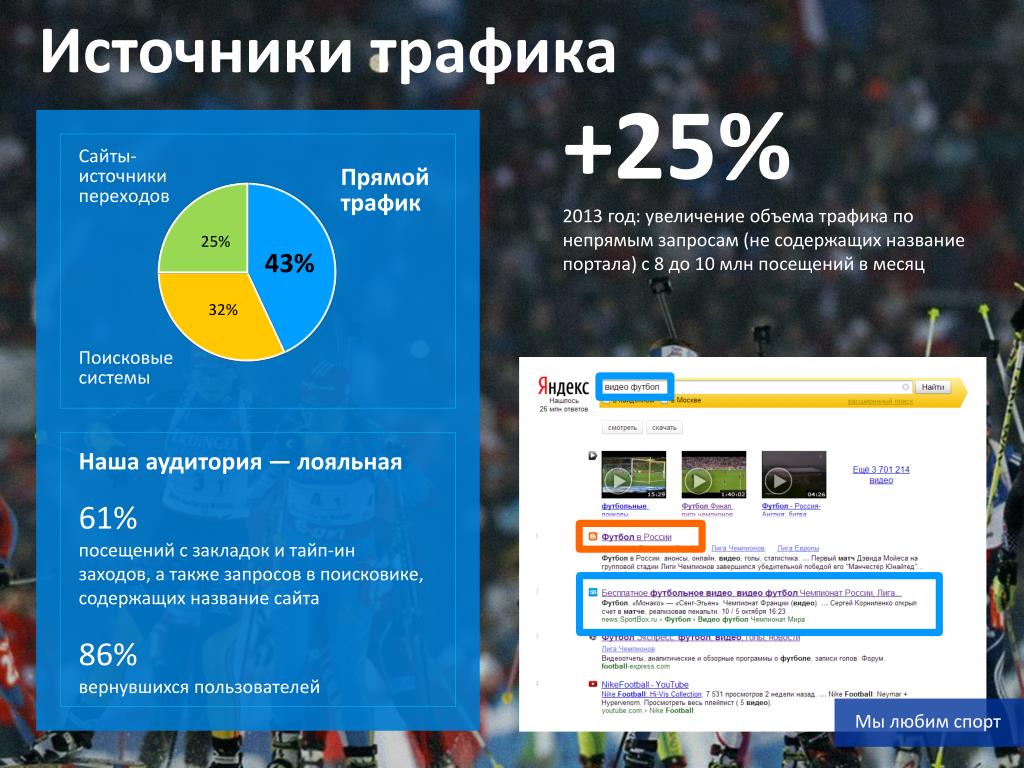 Источники трафика +25% 2013 год: увеличение объема трафика по непрямым запросам (не содержащих название портала) c 8 до 10 млн посещений в месяц Наша аудитория — лояльная 61% посещений с закладок и тайп-ин заходов, а также запросов в поисковике, содержащих название сайта 86% вернувшихся пользователей Мы любим спорт