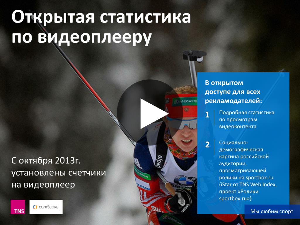 Открытая статистика по видеоплееру В открытом доступе для всех рекламодателей: Подробная статистика по просмотрам видеоконтента 1 2 Социально-демографическая картина российской аудитории, просматривающей ролики на sportbox.ru (iStarот TNS Web Index, проект «Ролики sportbox.ru») С октября 2013г. установлены счетчики на видеоплеер Мы любим спорт