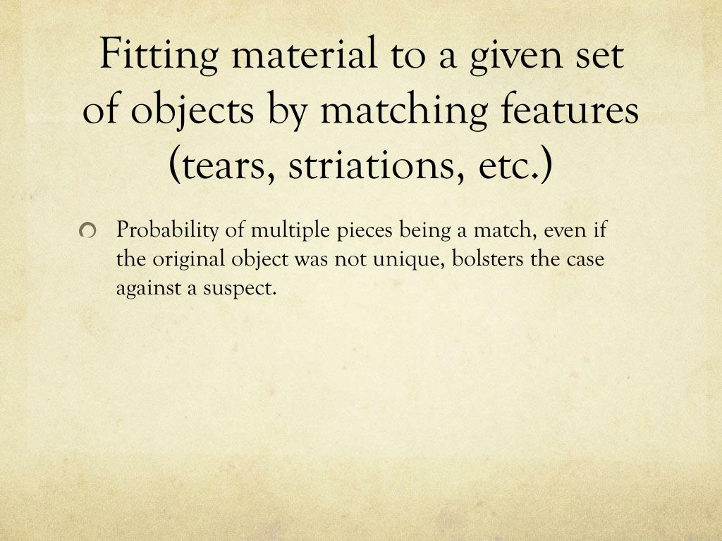 Fitting material to a given set of objects by matching features (tears, striations, etc.) • Probability of multiple pieces being a match, even if the original object was not unique, bolsters the case against a suspect.