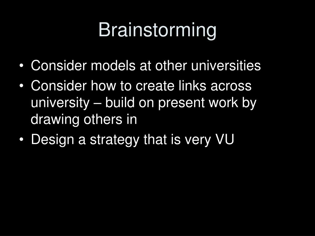 Brainstorming • Consider models at other universities • Consider how to create links across university – build on present work by drawing others in • Design a strategy that is very VU