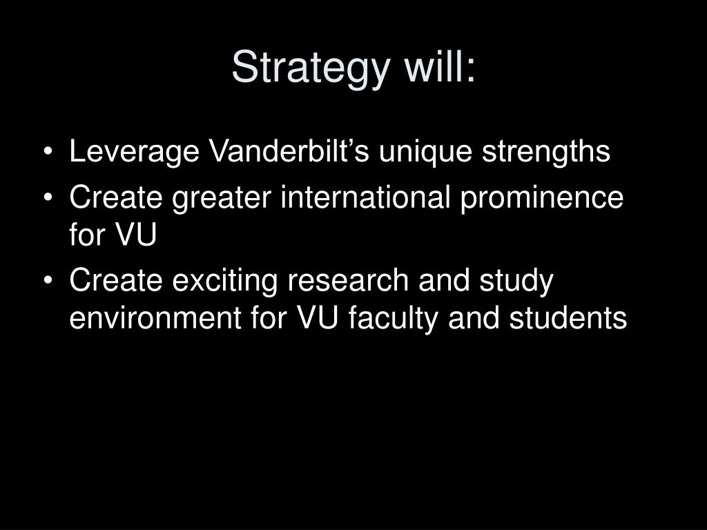 Strategy will: • Leverage Vanderbilt’s unique strengths • Create greater international prominence for VU • Create exciting research and study environment for VU faculty and students