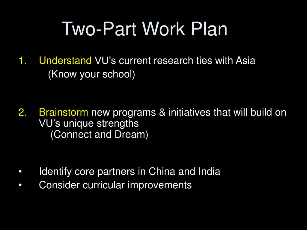 Two-Part Work Plan • Understand VU’scurrent research ties with Asia (Know your school) • Brainstorm new programs & initiatives that will build on VU’s unique strengths (Connect and Dream) • Identify core partners in China and India • Consider curricular improvements