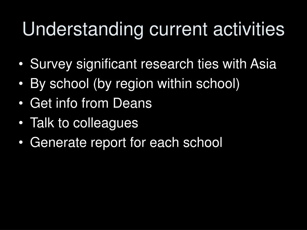 Understanding current activities • Survey significant research ties with Asia • By school (by region within school) • Get info from Deans • Talk to colleagues • Generate report for each school