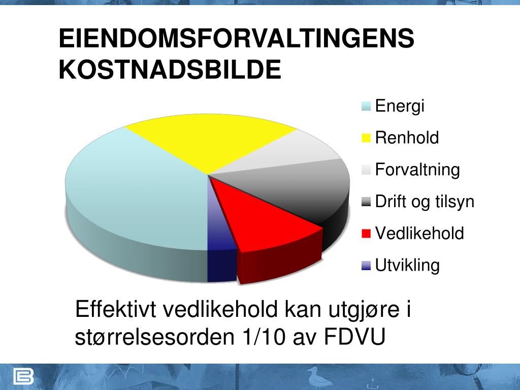EIENDOMSFORVALTINGENS KOSTNADSBILDE Effektivt vedlikehold kan utgjøre i størrelsesorden 1/10 av FDVU