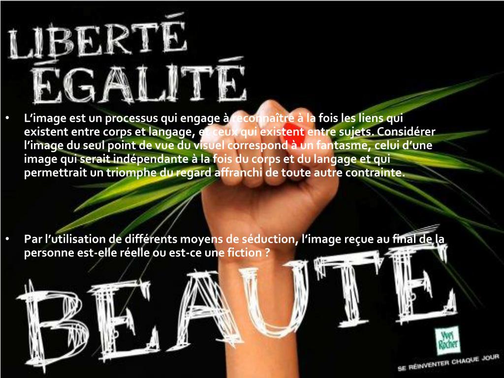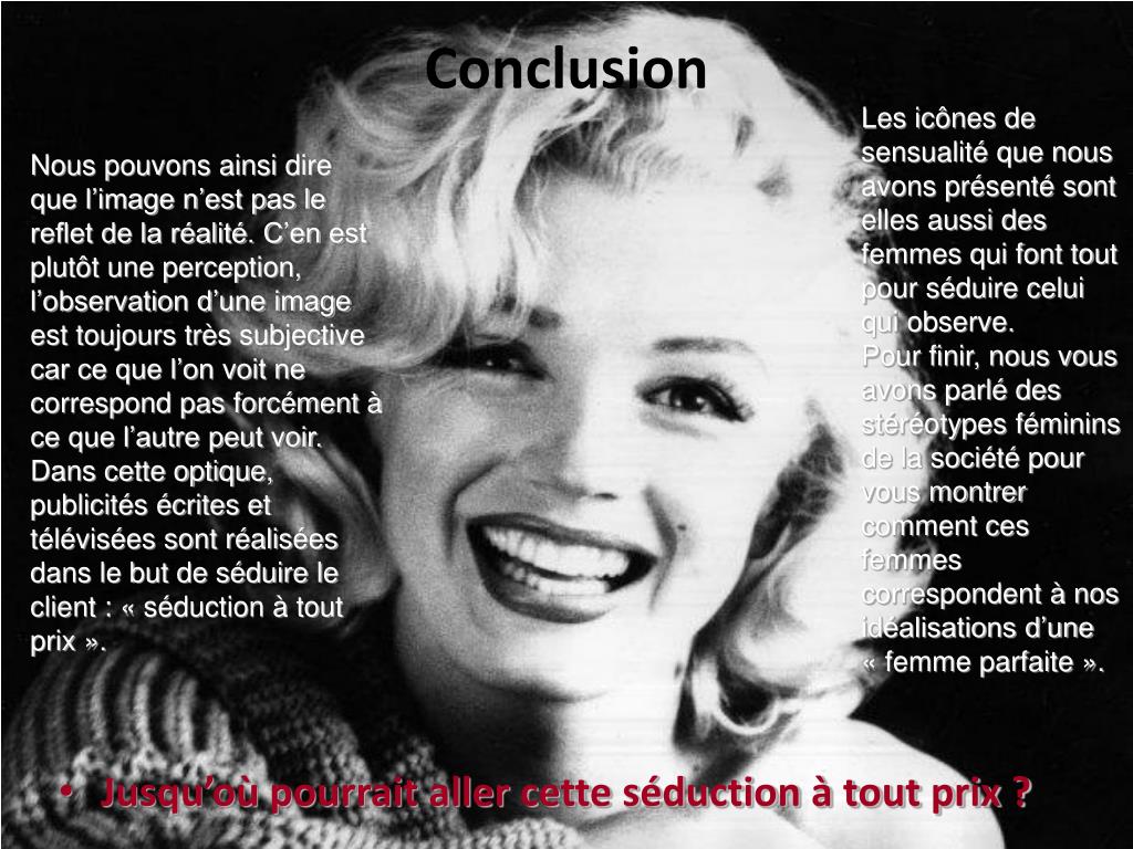 Conclusion Les icônes de sensualité que nous avons présenté sont elles aussi des femmes qui font tout pour séduire celui qui observe. Pour finir, nous vous avons parlé des stéréotypes féminins de la société pour vous montrer comment ces femmes correspondent à nos idéalisations d’une « femme parfaite ». Nous pouvons ainsi dire que l’image n’est pas le reflet de la réalité. C’en est plutôt une perception, l’observation d’une image est toujours très subjective car ce que l’on voit ne correspond pas forcément à ce que l’autre peut voir. Dans cette optique, publicités écrites et télévisées sont réalisées dans le but de séduire le client : « séduction à tout prix ». • Jusqu’où pourrait aller cette séduction à tout prix ?