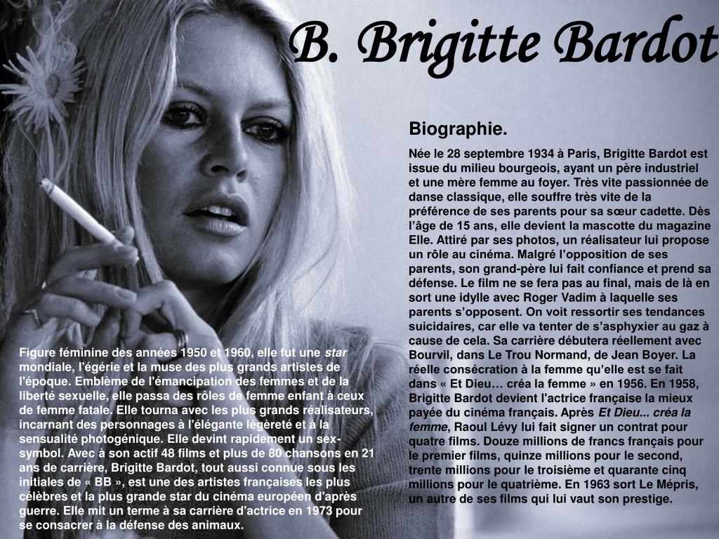 B. Brigitte Bardot Biographie. Née le 28 septembre 1934 à Paris, Brigitte Bardot est issue du milieu bourgeois, ayant un père industriel et une mère femme au foyer. Très vite passionnée de danse classique, elle souffre très vite de la préférence de ses parents pour sa sœur cadette. Dès l’âge de 15 ans, elle devient la mascotte du magazine Elle. Attiré par ses photos, un réalisateur lui propose un rôle au cinéma. Malgré l’opposition de ses parents, son grand-père lui fait confiance et prend sa défense. Le film ne se fera pas au final, mais de là en sort une idylle avec Roger Vadim à laquelle ses parents s’opposent. On voit ressortir ses tendances suicidaires, car elle va tenter de s’asphyxier au gaz à cause de cela. Sa carrière débutera réellement avec Bourvil, dans Le Trou Normand, de Jean Boyer. La réelle consécration à la femme qu’elle est se fait dans « Et Dieu… créa la femme » en 1956. En 1958, Brigitte Bardot devient l'actrice française la mieux payée du cinéma français. Après Et Dieu... créa la femme, Raoul Lévy lui fait signer un contrat pour quatre films. Douze millions de francs français pour le premier films, quinze millions pour le second, trente millions pour le troisième et quarante cinq millions pour le quatrième. En 1963 sort Le Mépris, un autre de ses films qui lui vaut son prestige. Figure féminine des années 1950 et 1960, elle fut une star mondiale, l'égérie et la muse des plus grands artistes de l'époque. Emblème de l'émancipation des femmes et de la liberté sexuelle, elle passa des rôles de femme enfant à ceux de femme fatale. Elle tourna avec les plus grands réalisateurs, incarnant des personnages à l'élégante légèreté et à la sensualité photogénique. Elle devint rapidement un sex-symbol. Avec à son actif 48 films et plus de 80 chansons en 21 ans de carrière, Brigitte Bardot, tout aussi connue sous les initiales de « BB », est une des artistes françaises les plus célèbres et la plus grande star du cinéma européen d'après guerre. Elle mit un terme à sa carrière d'actrice en 1973 pour se consacrer à la défense des animaux.