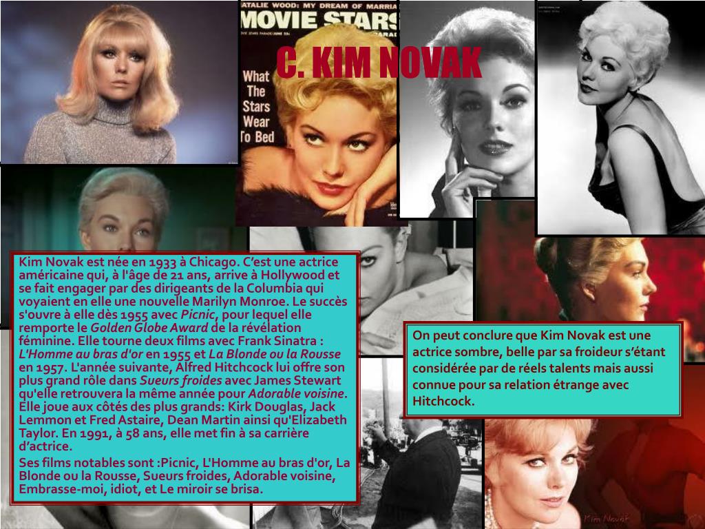 Kim Novak C. KIM NOVAK Kim Novak est née en 1933 à Chicago. C’est une actrice américaine qui, à l'âge de 21 ans, arrive à Hollywood et se fait engager par des dirigeants de la Columbia qui voyaient en elle une nouvelle Marilyn Monroe. Le succès s'ouvre à elle dès 1955 avec Picnic, pour lequel elle remporte le Golden Globe Award de la révélation féminine. Elle tourne deux films avec Frank Sinatra : L'Homme au bras d'or en 1955 et La Blonde ou la Rousse en 1957. L'année suivante, Alfred Hitchcock lui offre son plus grand rôle dans Sueurs froides avec James Stewart qu'elle retrouvera la même année pour Adorable voisine. Elle joue aux côtés des plus grands: Kirk Douglas, Jack Lemmon et Fred Astaire, Dean Martin ainsi qu'Elizabeth Taylor. En 1991, à 58 ans, elle met fin à sa carrière d’actrice. Ses films notables sont :Picnic, L'Homme au bras d'or, La Blonde ou la Rousse, Sueurs froides, Adorable voisine, Embrasse-moi, idiot, et Le miroir se brisa. On peut conclure que Kim Novak est une actrice sombre, belle par sa froideur s’étant considérée par de réels talents mais aussi connue pour sa relation étrange avec Hitchcock.