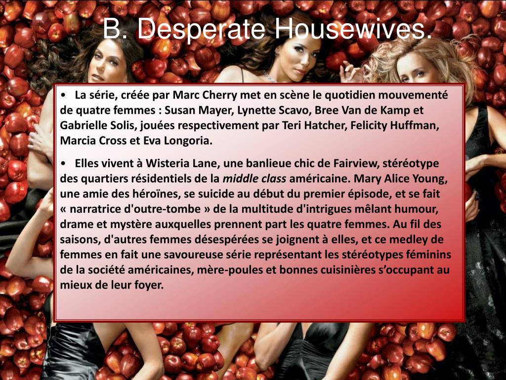 B. Desperate Housewives. • La série, créée par Marc Cherry met en scène le quotidien mouvementé de quatre femmes : Susan Mayer, Lynette Scavo, Bree Van de Kamp et Gabrielle Solis, jouées respectivement par Teri Hatcher, Felicity Huffman, Marcia Cross et Eva Longoria. • Elles vivent à Wisteria Lane, une banlieue chic de Fairview, stéréotype des quartiers résidentiels de la middle class américaine. Mary Alice Young, une amie des héroïnes, se suicide au début du premier épisode, et se fait « narratrice d'outre-tombe » de la multitude d'intrigues mêlant humour, drame et mystère auxquelles prennent part les quatre femmes. Au fil des saisons, d'autres femmes désespérées se joignent à elles, et ce medley de femmes en fait une savoureuse série représentant les stéréotypes féminins de la société américaines, mère-poules et bonnes cuisinières s’occupant au mieux de leur foyer.