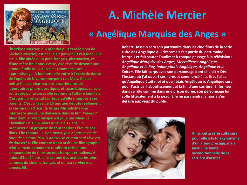 A. Michèle Mercier « Angélique Marquise des Anges » Robert Hossein sera son partenaire dans les cinq films de la série culte des Angélique qui désormais fait partie du patrimoine français et fait sauter l'audimat à chaque passage à la télévision : Angélique Marquise des Anges, Merveilleuse Angélique, Angélique et le Roy, Indomptable Angélique, Angélique et le Sultan. Elle fait corps avec son personnage dont elle dit « Dès l'instant où j'ai ouvert ces livres et commencé à les lire, j'ai su qu'Angélique était moi et que j'étais Angélique ». Angélique sera, pour l'actrice, l'aboutissement et la fin d'une carrière. Enfermée dans ce rôle comme dans une prison dorée, son personnage lui colle littéralement à la peau. Elle ne parviendra jamais à s'en défaire aux yeux du public. Jocelyne Mercier, qui prendra plus tard le nom de Michèle Mercier, est née le 1er janvier 1939 à Nice. Elle est la fille aînée d'un père français, pharmacien, et d'une mère italienne. Petite, elle rêve de devenir une grande étoile de la danse et commence son apprentissage. À huit ans, elle entre à l'école de danse de l'opéra de Nice comme petit rat. Mais, fille et petite-fille de pharmaciens propriétaires de laboratoires pharmaceutiques et cosmétiques, sa voie est tracée par avance: elle reprendra l'affaire familiale. C'est par un refus catégorique qu'elle s'oppose à ses parents. C’est à l’âge de 15 ans que débute réellement sa carrière d’actrice : la future Michèle Mercier interprète une jeune danseuse dans le film J'avais 7 filles dont le rôle principal est joué par Maurice Chevalier. En 1956, alors qu’elle a 17 ans, un producteur lui propose de tourner dans l’un de ses films. Elle répond : « Non merci, je n'ai pas envie de faire de cinéma! Je suis danseuse et mon seul rêve est de danser! ». Elle compte à son actif une filmographie relativement abondante totalisant près d'une cinquantaine de films surtout français et italiens. A aujourd’hui 74 ans, elle est une des actrices les plus connues du cinéma français et un sexsymbol des années 60. Ainsi, cette série culte sera pour elle à la fois synonyme d’un grand prestige, mais aussi une limite inconditionnelle de sa carrière d’actrice.