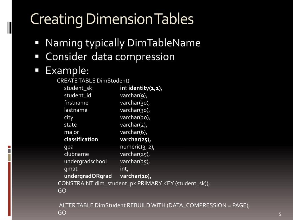 Creating Dimension Tables • Naming typically DimTableName • Consider data compression • Example: CREATE TABLE DimStudent( student_skintidentity(1,1), student_idvarchar(9), firstnamevarchar(30), lastnamevarchar(30), city varchar(20), state varchar(2), major varchar(6), classification varchar(25), gpa numeric(3, 2), clubnamevarchar(25), undergradschoolvarchar(25), gmatint, undergradORgradvarchar(10), CONSTRAINT dim_student_pk PRIMARY KEY (student_sk)); GO ALTER TABLE DimStudent REBUILD WITH (DATA_COMPRESSION = PAGE); GO