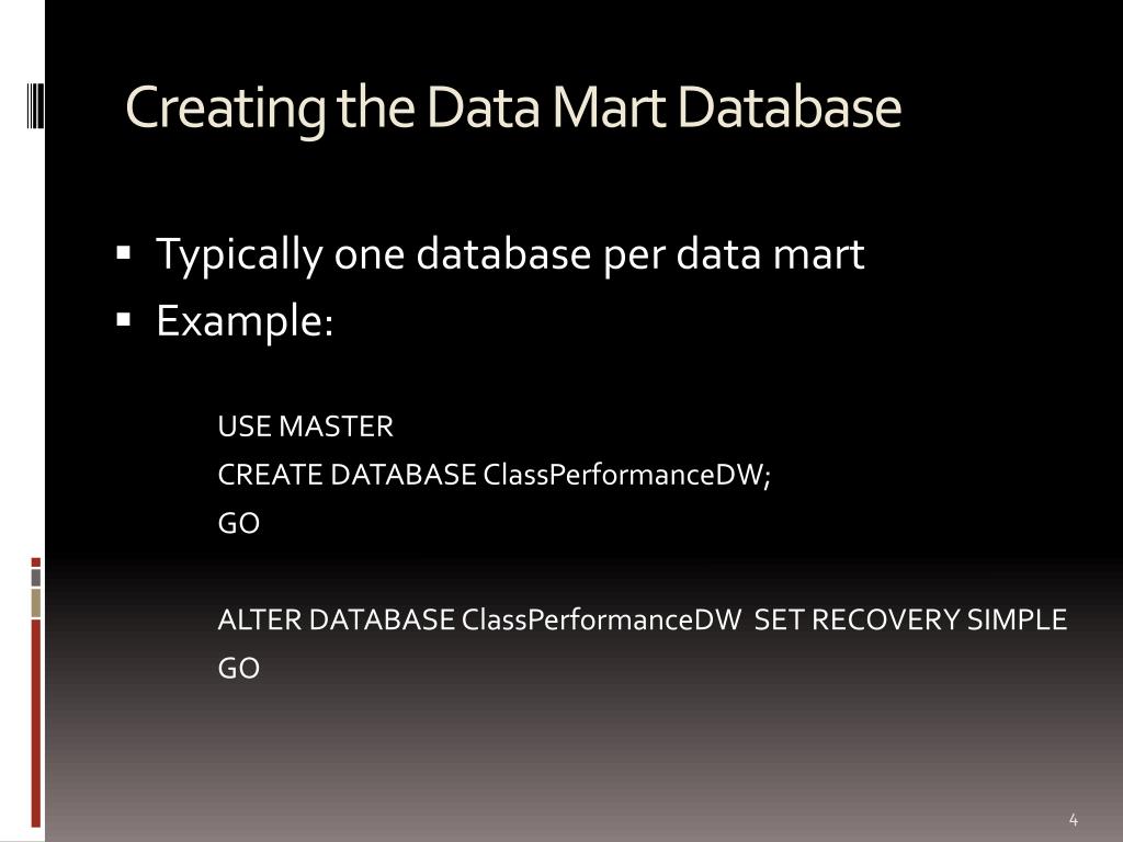 Creating the Data Mart Database • Typically one database per data mart • Example: USE MASTER CREATE DATABASE ClassPerformanceDW; GO ALTER DATABASE ClassPerformanceDW SET RECOVERY SIMPLE GO
