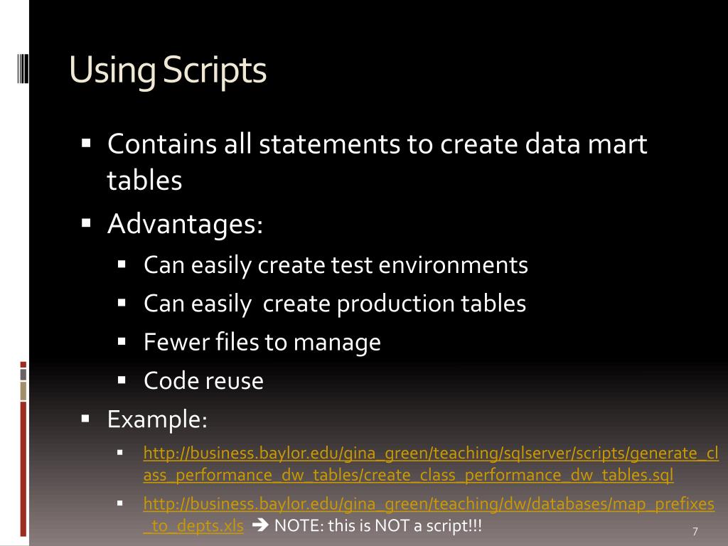 Using Scripts • Contains all statements to create data mart tables • Advantages: • Can easily create test environments • Can easily create production tables • Fewer files to manage • Code reuse • Example: • http://business.baylor.edu/gina_green/teaching/sqlserver/scripts/generate_class_performance_dw_tables/create_class_performance_dw_tables.sql • http://business.baylor.edu/gina_green/teaching/dw/databases/map_prefixes_to_depts.xls NOTE: this is NOT a script!!!
