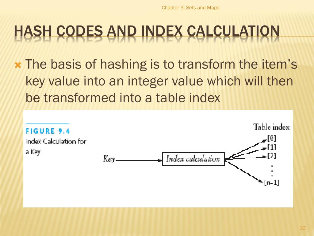 The basis of hashing is to transform the item’s key value into an integer value which will then be transformed into a table index Chapter 9: Sets and Maps Hash Codes and Index Calculation