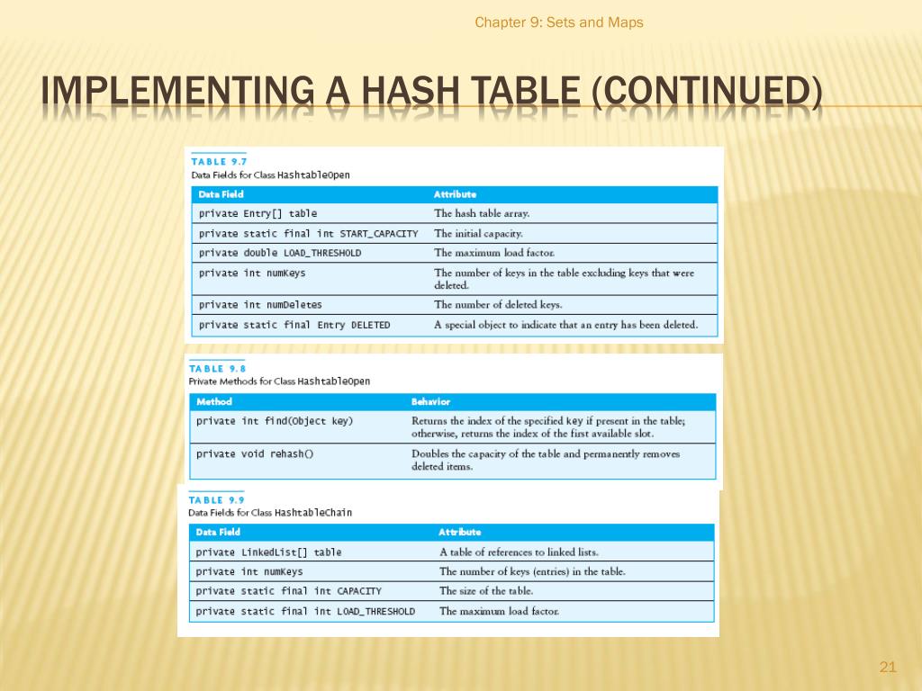 The Java API uses a hash table to implement both the Map and Set interfaces The task of implementing the two interfaces is simplified by the inclusion of abstract classes AbstractMap and AbstractSet in the Collection hierarchy Chapter 9: Sets and Maps Implementing the Java Map and Set Interfaces
