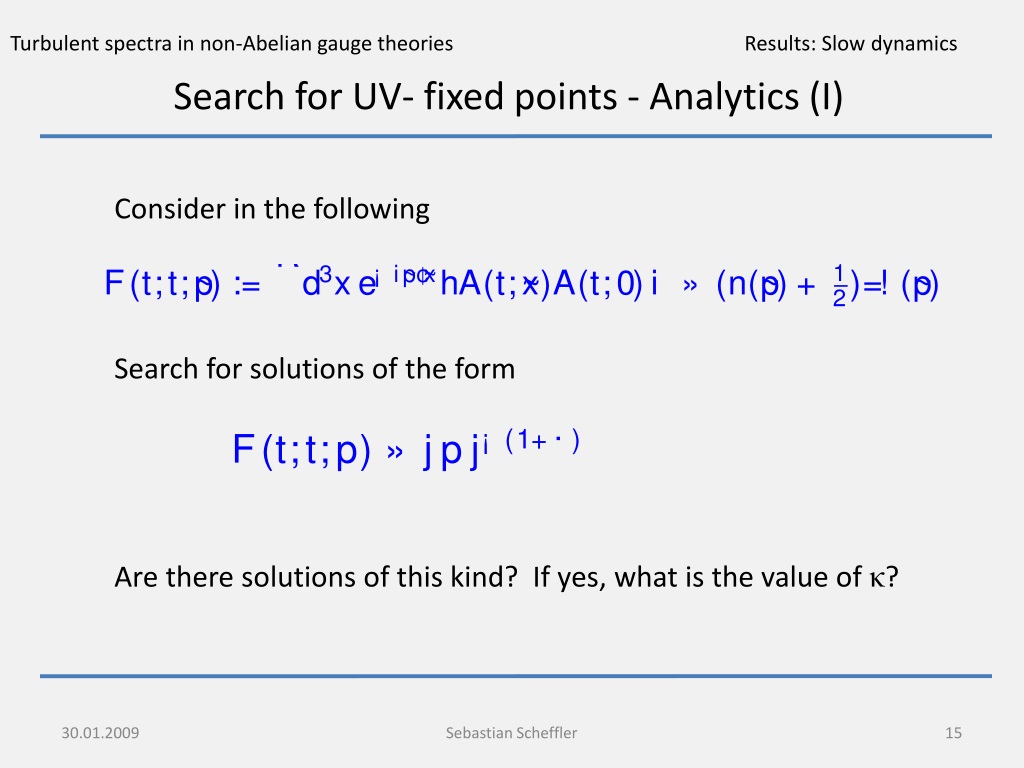 Turbulent spectra in non-Abeliangaugetheories Searchfor UV- fixedpoints - Analytics (I) Consider in thefollowing Searchforsolutionsofthe form Are theresolutionsofthiskind? Ifyes, whatisthevalueofκ? Results: Slow dynamics Sebastian Scheffler