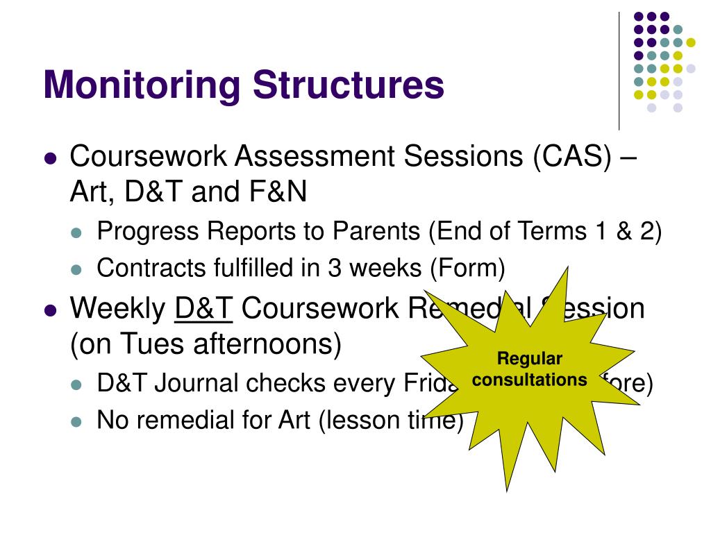 Monitoring Structures • Coursework Assessment Sessions (CAS) – Art, D&T and F&N • Progress Reports to Parents (End of Terms 1 & 2) • Contracts fulfilled in 3 weeks (Form) • Weekly D&T Coursework Remedial Session (on Tues afternoons) • D&T Journal checks every Friday (4 days before) • No remedial for Art (lesson time) Regular consultations