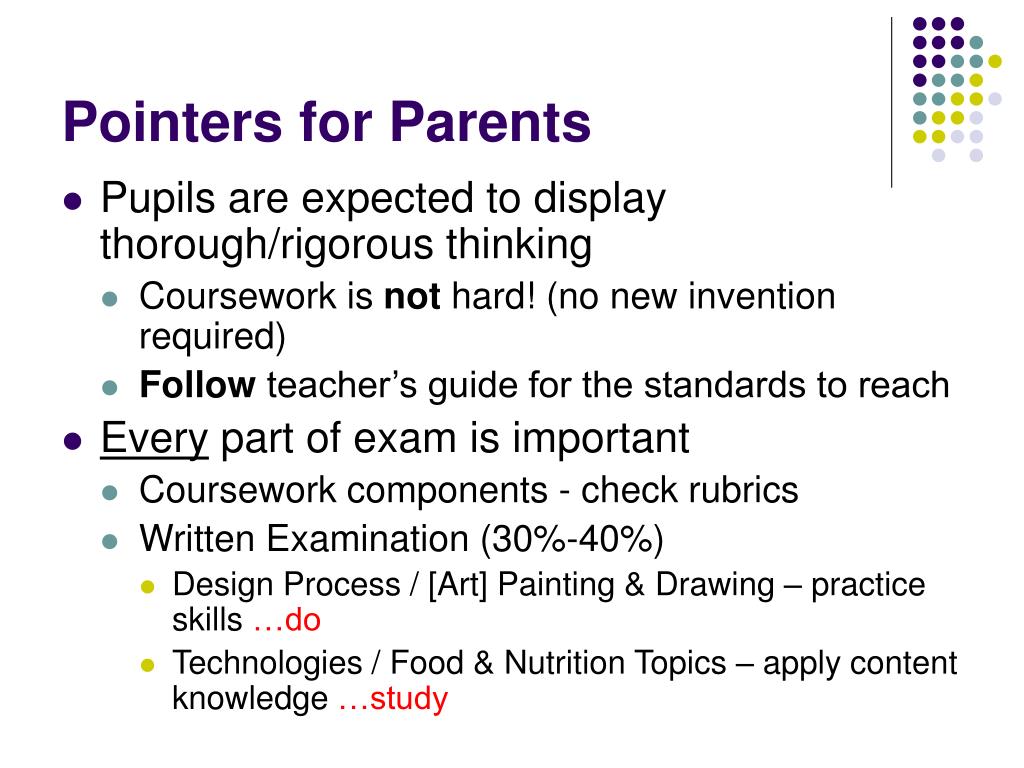 Pointers for Parents • Pupils are expected to display thorough/rigorous thinking • Coursework is not hard! (no new invention required) • Follow teacher’s guide for the standards to reach • Every part of exam is important • Coursework components - check rubrics • Written Examination (30%-40%) • Design Process / [Art] Painting & Drawing – practice skills …do • Technologies / Food & Nutrition Topics – apply content knowledge …study