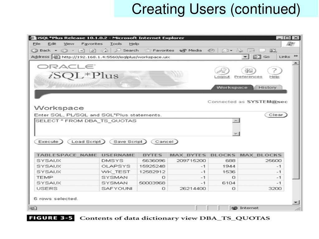 Creating Users • Must be a standardized, well-documented, and securely managed process • In Oracle10g, use the CREATE USER statement: • Part of the a Data Definition Language (DDL)