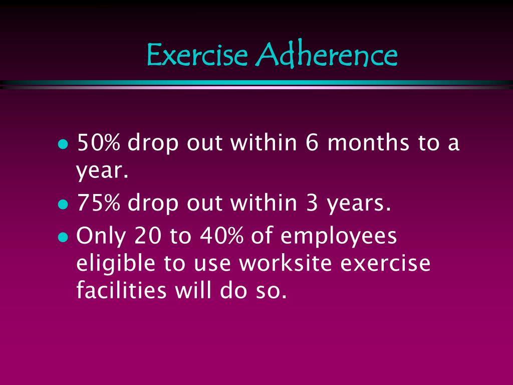 Exercise Adherence • 50% drop out within 6 months to a year. • 75% drop out within 3 years. • Only 20 to 40% of employees eligible to use worksite exercise facilities will do so.