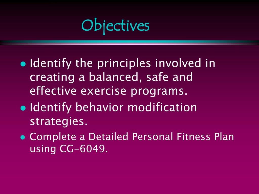 Objectives • Identify the principles involved in creating a balanced, safe and effective exercise programs. • Identify behavior modification strategies. • Complete a Detailed Personal Fitness Plan using CG-6049.