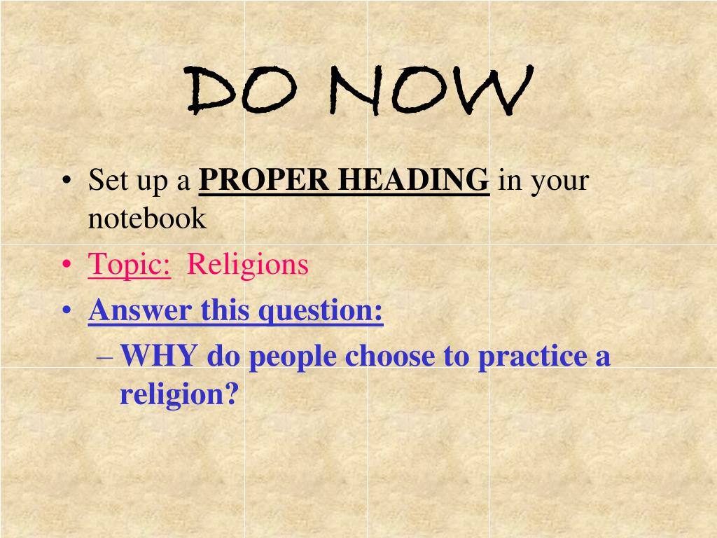 DO NOW • Set up a PROPER HEADING in your notebook • Topic: Religions • Answer this question: • WHY do people choose to practice a religion?
