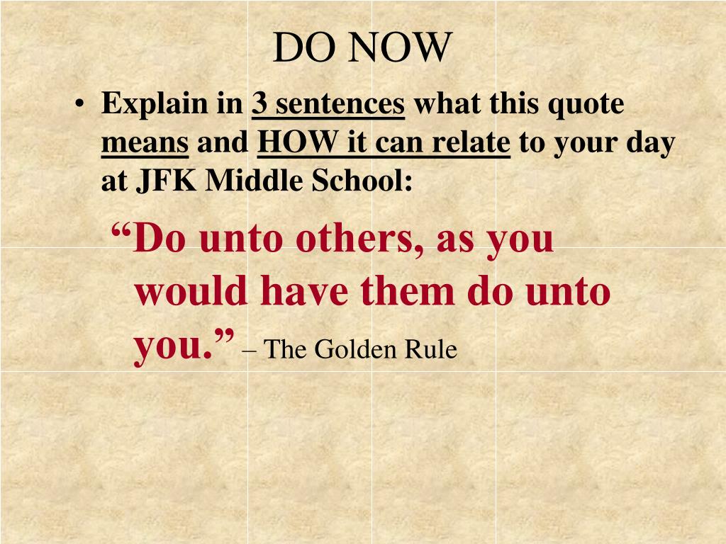 DO NOW • Explain in 3 sentences what this quote means and HOW it can relate to your day at JFK Middle School: “Do unto others, as you would have them do unto you.” – The Golden Rule