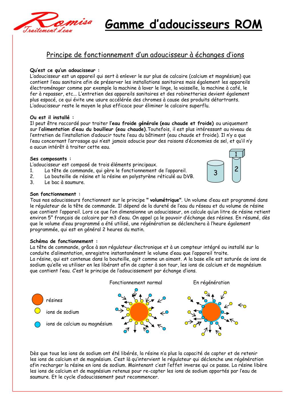 Gamme d’adoucisseurs ROM Principe de fonctionnement d’un adoucisseur à échanges d’ions • Qu’est ce qu’un adoucisseur : • L’adoucisseur est un appareil qui sert à enlever le sur plus de calcaire (calcium et magnésium) que • contient l’eau sanitaire afin de préserver les installations sanitaires mais également les appareils • électroménager comme par exemple la machine à laver le linge, la vaisselle, la machine à café, le • fer à repasser, etc... L’entretien des appareils sanitaires et des robinetteries devient également • plus espacé, ce qui évite une usure accélérée des chromes à cause des produits détartrants. • L’adoucisseur reste le moyen le plus efficace pour éliminer le calcaire superflu. • Ou est il installé : • Il peut être raccordé pour traiter l’eau froide générale(eau chaude et froide) ou uniquement • sur l’alimentation d’eau du bouilleur (eau chaude).Toutefois, il est plus intéressant au niveau de • l’entretien de l’installation d’adoucir toute l’eau du bâtiment (eau chaude et froide). Il n’y a que • l’eau concernant l’arrosage qui n’est jamais adoucie pour des raisons d’économies de sel, et qu’il n’y • a aucun intérêt à traiter cette eau. • Ses composants : • L’adoucisseur est composé de trois éléments principaux. • La tête de commande, qui gère le fonctionnement de l‘appareil. • La bouteille de résine et la résine en polystyrène réticulé au DVB. • Le bac à saumure. • Son fonctionnement : • Tous nos adoucisseurs fonctionnent sur le principe "volumétrique". Un volume d’eau est programmé dans • le régulateur de la tête de commande. Il dépend de la dureté de l’eau du réseau et du volume de résine • que contient l’appareil. Lors ce que l’on dimensionne un adoucisseur, on calcule qu’un litre de résine retient • environ 5° français de calcaire par m3 d’eau. On appel ça le pouvoir d’échange des résines. En résumé, dès • que le volume d’eau programmé a été utilisé, une régénération se déclenchera à l’heure également • programmée, qui est en général 2 heures du matin. • Schéma de fonctionnement : • La tête de commande, grâce à son régulateur électronique et à un compteur intégré ou installé sur la • conduite d’alimentation, enregistre instantanément le volume d’eau que l’appareil traite. • La résine, qui est contenue dans la bouteille, agit comme un aimant. A la base elle est saturée de ions de • sodium qu’elle va utiliser en les libérant afin de capter à son tour, les ions de calcium et de magnésium • que contient l’eau. C’est le principe de l’adoucissement par échange d’ions. • Fonctionnement normal En régénération • résines • ions de sodium • ions de calcium ou magnésium • Dès que tous les ions de sodium ont été libérés, la résine n’a plus la capacité de capter et de retenir • les ions de calcium et de magnésium. C’est là qu’intervient le régulateur qui déclenche une régénération • afin recharger la résine en ions de sodium. Maintenant c’est l’effet inverse qui ce passe. La résine libère • les ions de calcium et de magnésium retenus pour re-capter les ions de sodium apportés par l’eau de • saumure. Et le cycle d’adoucissement peut recommencer. 1 2 3