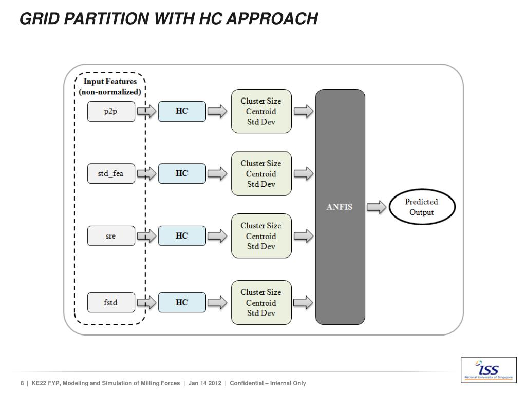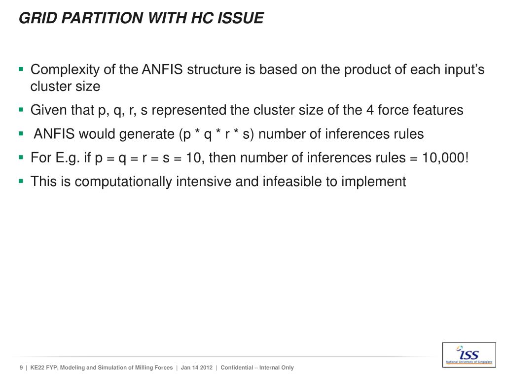 Grid Partition with HC Issue • Complexity of the ANFIS structure is based on the product of each input’s cluster size • Given that p, q, r, s represented the cluster size of the 4 force features • ANFIS would generate (p * q * r * s) number of inferences rules • For E.g. if p = q = r = s = 10, then number of inferences rules = 10,000! • This is computationally intensive and infeasible to implement