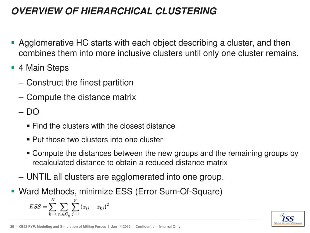Overview of Hierarchical Clustering • Agglomerative HC starts with each object describing a cluster, and then combines them into more inclusive clusters until only one cluster remains. • 4 Main Steps • Construct the finest partition • Compute the distance matrix • DO • Find the clusters with the closest distance • Put those two clusters into one cluster • Compute the distances between the new groups and the remaining groups by recalculated distance to obtain a reduced distance matrix • UNTIL all clusters are agglomerated into one group. • Ward Methods, minimize ESS (Error Sum-Of-Square)