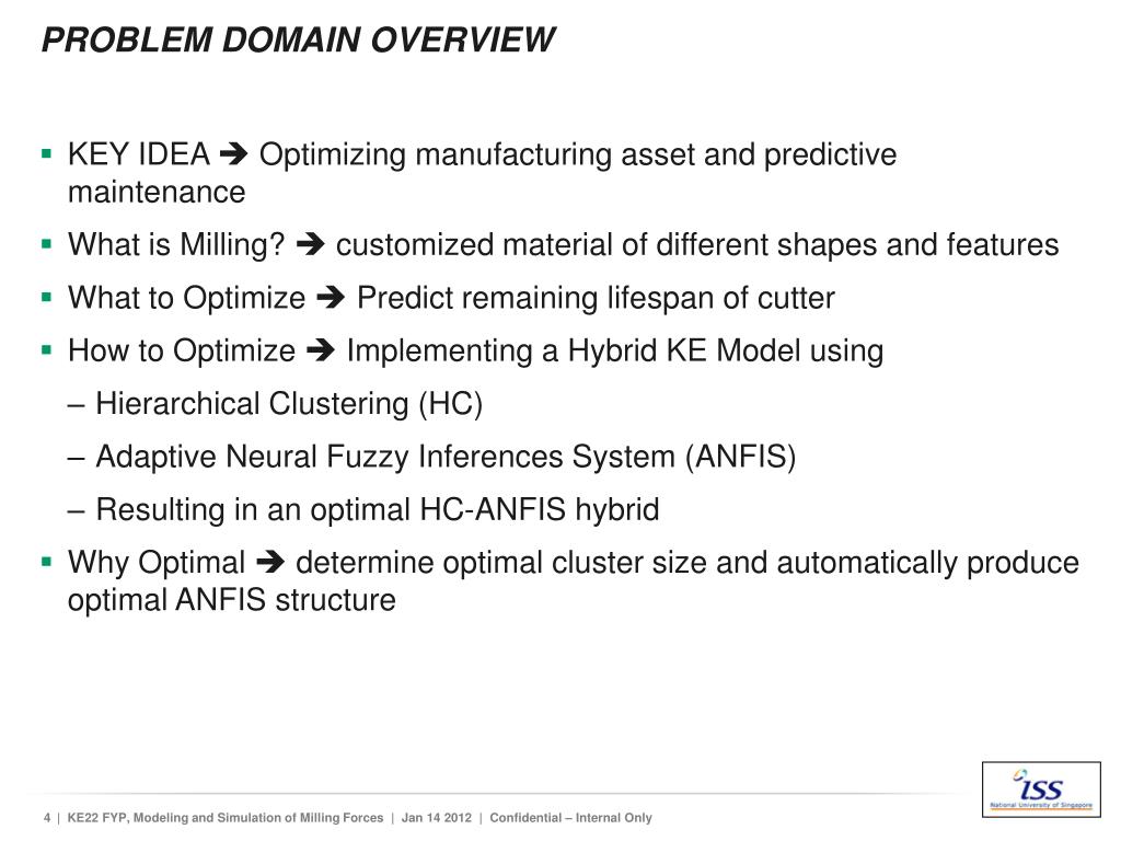 Problem Domain Overview • KEY IDEA Optimizing manufacturing asset and predictive maintenance • What is Milling? customized material of different shapes and features • What to Optimize Predict remaining lifespan of cutter • How to Optimize Implementing a Hybrid KE Model using • Hierarchical Clustering (HC) • Adaptive Neural Fuzzy Inferences System (ANFIS) • Resulting in an optimal HC-ANFIS hybrid • Why Optimal determine optimal cluster size and automatically produce optimal ANFIS structure