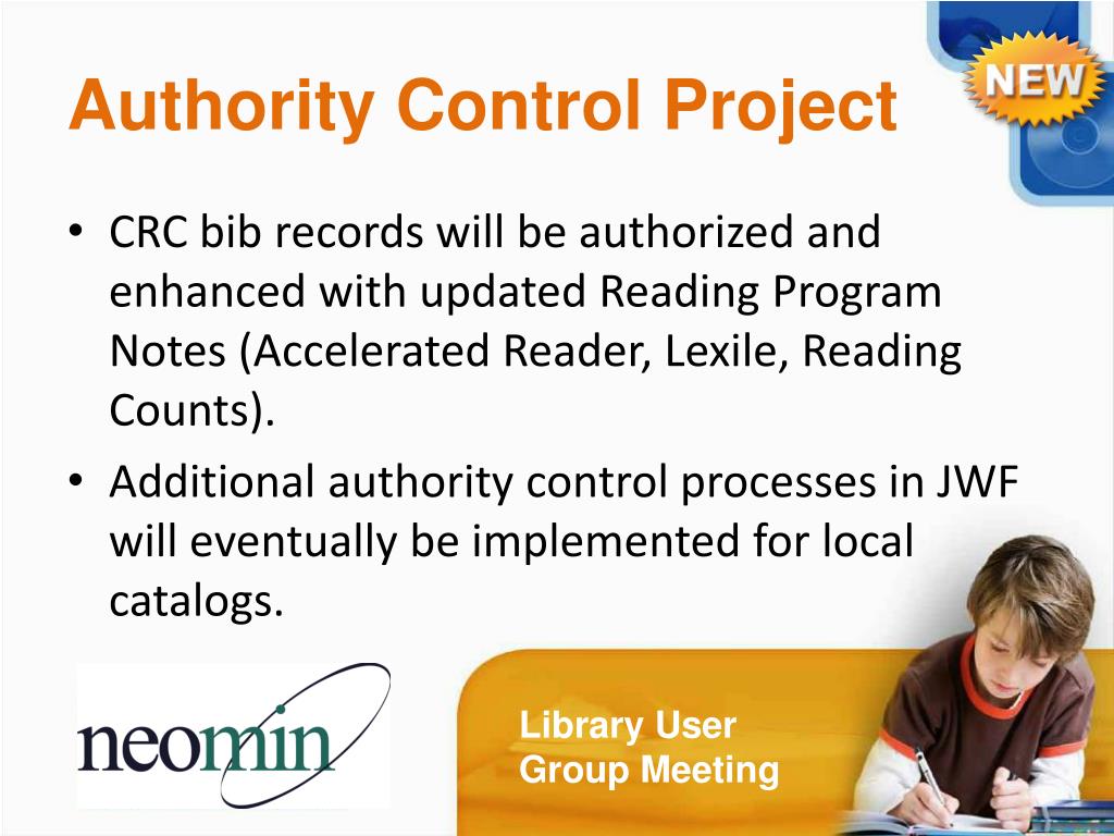 Authority Control Project • CRC bib records will be authorized and enhanced with updated Reading Program Notes (Accelerated Reader, Lexile, Reading Counts). • Additional authority control processes in JWF will eventually be implemented for local catalogs. Library User Group Meeting