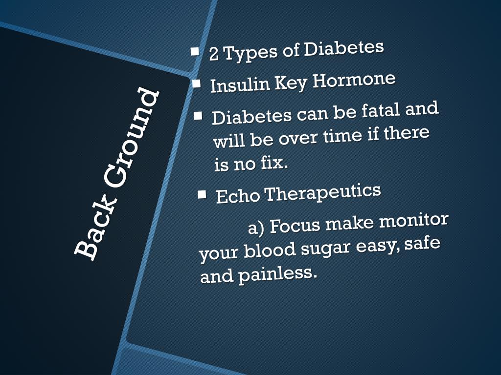 2 Types of Diabetes • Insulin Key Hormone • Diabetes can be fatal and will be over time if there is no fix. • Echo Therapeutics a) Focus make monitor your blood sugar easy, safe and painless. Back Ground