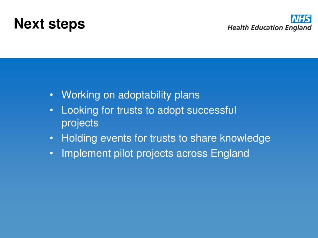 Next steps • Working on adoptability plans • Looking for trusts to adopt successful projects • Holding events for trusts to share knowledge • Implement pilot projects across England